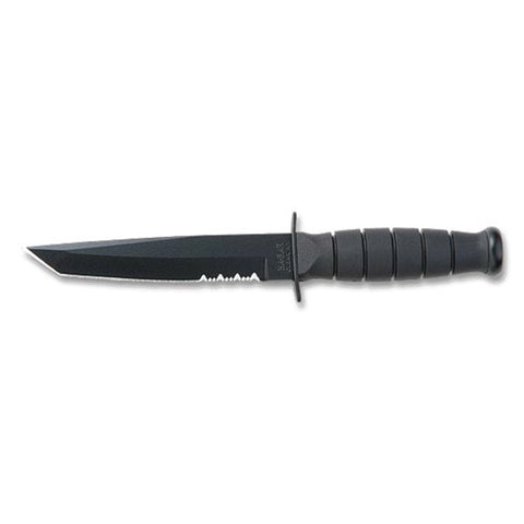 Featuring Ka-Bar's famous oval shaped leather handles, the Short Ka-Bar version of the traditional Ka-Bar is made just as well as the original. Includes leather sheath. Tanto Blade. Non-reflective black coated blade. Kraton G handle with grooves for a secure grip. Powdered Metal Butt Cap.