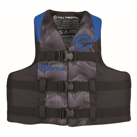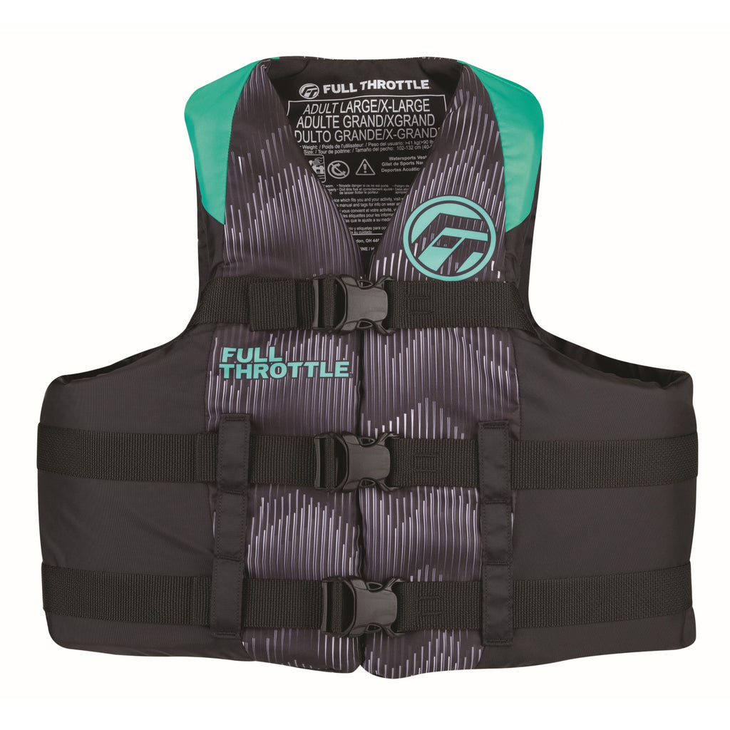 The Full Throttle adult nylon life jacket is comfortable to wear for a variety of activities, including skiing, tubing, boating, fishing, or relaxing on the water. This vest is made of quality, durable fabrics and uses lightweight, durable foam that contours to your body and doesn't hinder your mobility. The adjustable belts and chest strap keep the vest in place and provides ride-up or shifting. This U.S. Coast Guard and Transport Canada approved life jacket fits adults 90 lbs and over.